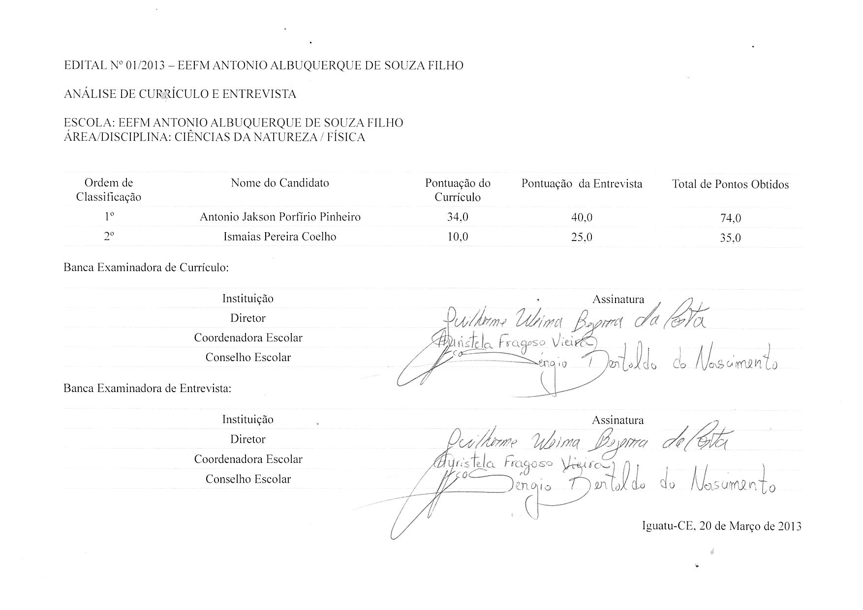 Resultado da Seleção Pública para professor temporário da EEM Antonio Albuquerque