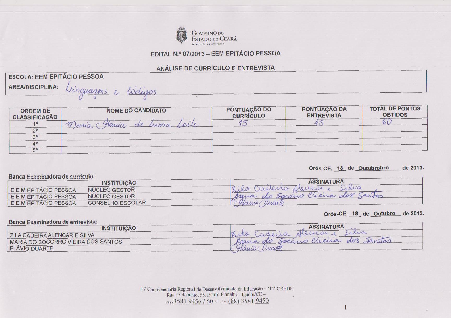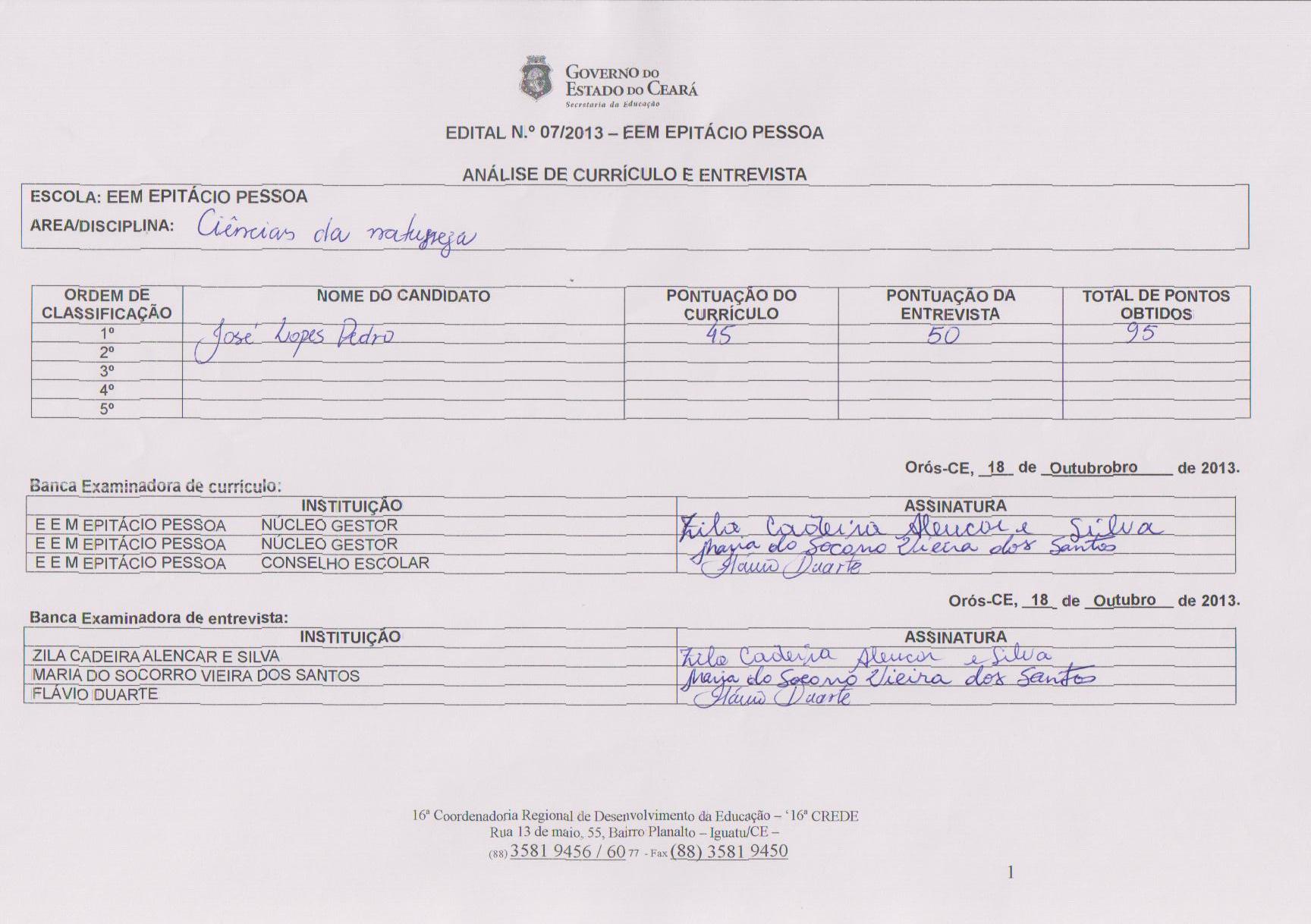 Resultado do Edital 07-2013 da EEM Epitácio Pessoa