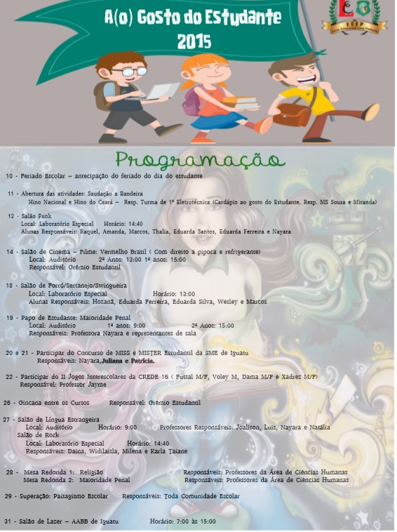 Desde o dia 11 de agosto, a EEEP Lucas Emmanuel Lima Pinheiro desenvolve programação especial em alusão ao mês do estudante, executando um conjunto de atividades denominada A(O)GOSTO DO ESTUDANTE. A proposta é norteada pelo projeto executado pela Secretaria de Educação do Estado no ano de 2013. O objetivo é fortalecer o vínculo com os alunos através de atividades culturais, recreativas e de preparação para atividades que buscam a integração e motivação dos estudantes.