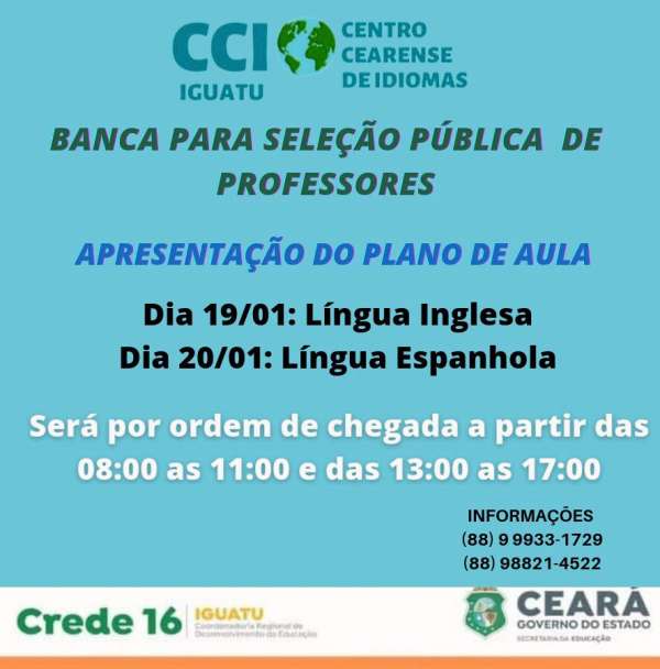 CCI de Iguatu divulga horários das apresentações dos planos de aula – Seleção de Profeasores